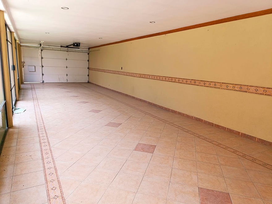 Planta Baja: Cochera cerrada para 3 autos, con portón eléctrico, y un práctico mueble de madera.