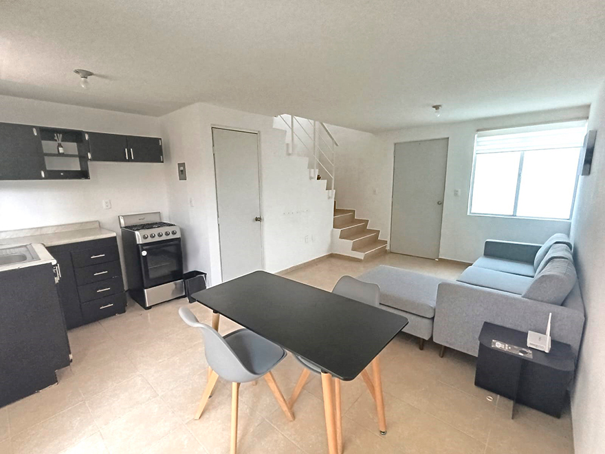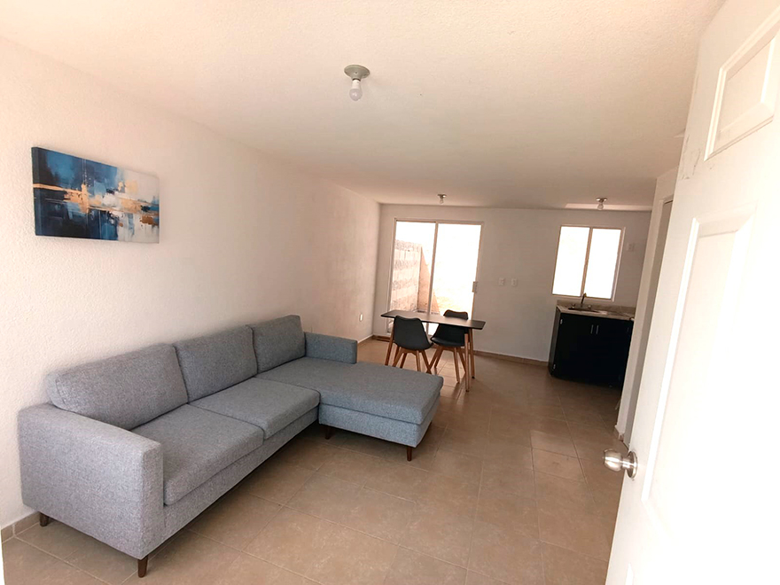 Cochera abierta para 1 auto, Sala, incluye sala esquinera. Comedor incluye una pequeña mesa con dos sillas. Cocina