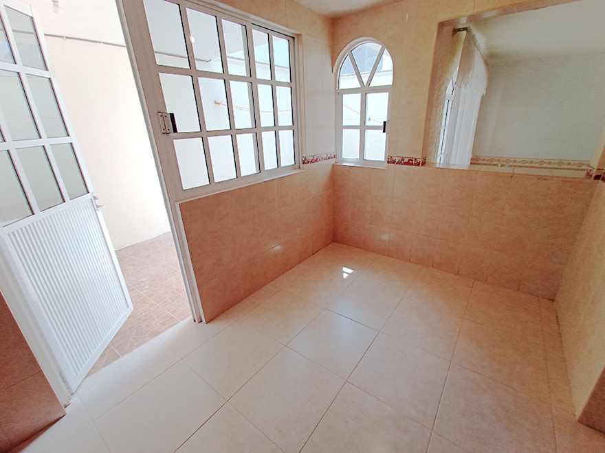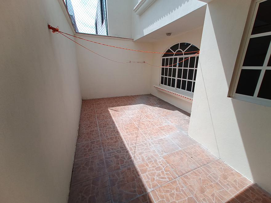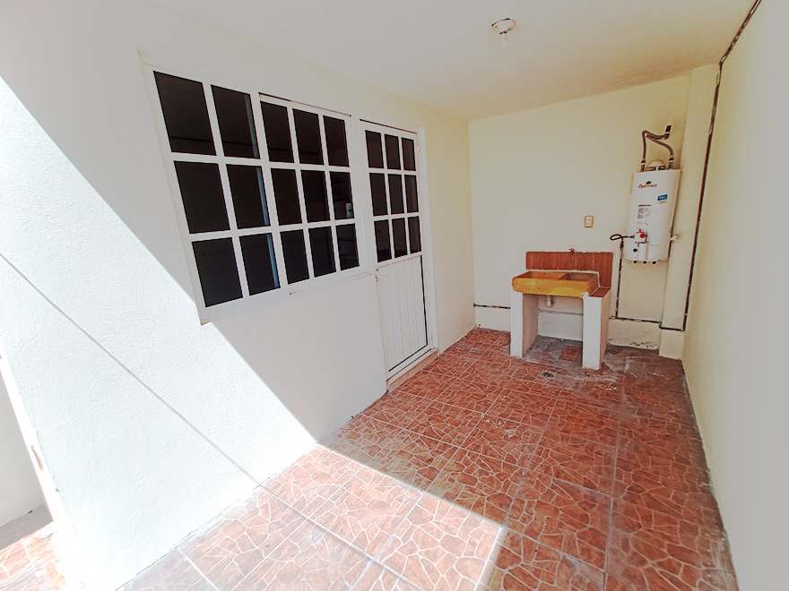 Patio de servicio con piso cerámico y área de lavado bajo techo.