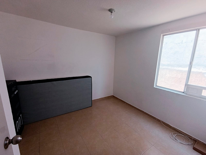 Dos Recámaras tamaño matrimonial, una incluye closet, mueble para TV y colchón Individual. Un baño completo para compartir.